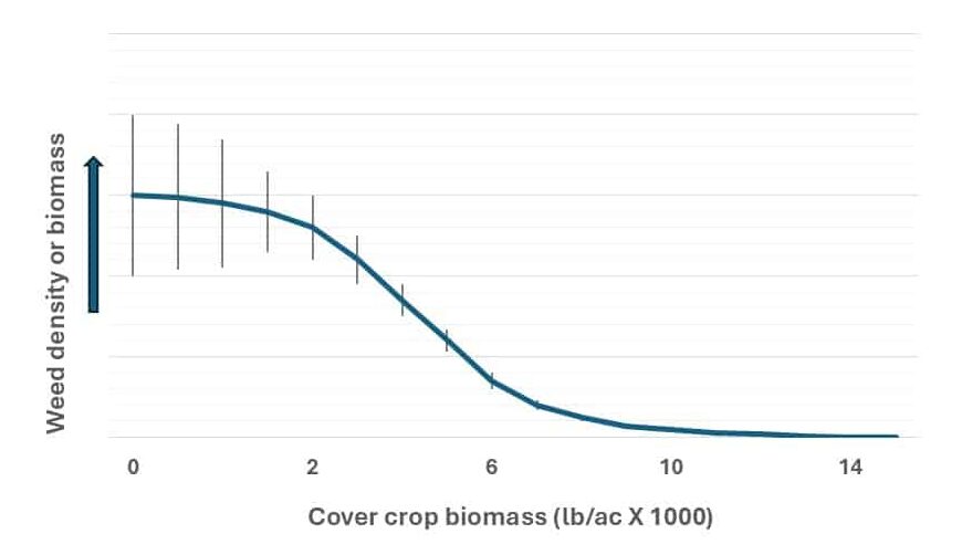 Once the cover is terminated, the amount of cover crop biomass or dead mulch is the key to weed suppression. Weed suppression from cover crops increases as biomass increases, up to a certain level. The amount of dead biomass or mulch necessary to suppress summer annual weeds varies by both region and also weed species. As explained in #4 previously, small-seeded broadleaves are most sensitive to suppression with mulch, while larger-seeded broadleaves and annual grasses are more difficult to suppress.