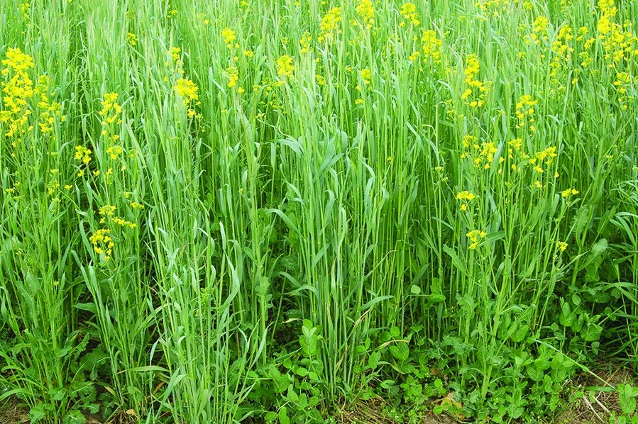 The best cover crops for weed suppression emerge and grow quickly, rapidly shade the ground, produce large amounts of biomass, and have lasting residue that acts as a mulch after the cover crop has been terminated. In late summer and fall, grass cover crop species like cereal rye, wheat, and oats suppress weeds better than legumes. Brassicas such as forage radish can provide good weed suppression through early spring when planted in late summer. In general, legume cover crops are less competitive with weeds because they can be slow to establish, and some weeds take advantage of their ability to fix nitrogen, which the weeds can use to become more competitive. Farmers that want to fix nitrogen and suppress weeds can plant a mixture of grass and legumes, such as cereal rye plus hairy vetch or crimson clover.