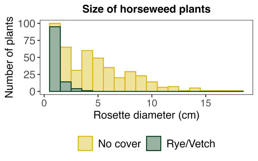 Can weed suppressive cover crops improve foliar herbicide performance? Many growers rely on these applications especially for control of emerged herbicide-resistant weeds in their major field crops. One advantage of using a weed suppressive cover crop mulch can be the ability to target fewer and smaller emerged weeds either in the burndown or postemergence application. In a Penn State study, a cereal rye/hairy vetch cover crop reduced the size and number of horseweed plants (Figure 7) at the time of burndown application. In the same study, it also reduced the size and frequency or occurrence of taller pigweed plants at the time of POST application (data not shown). This could allow delaying or even eliminating a post herbicide application because of fewer and smaller weeds and translate into direct cost savings as well as reducing the selection pressure for herbicide resistance by reducing herbicide inputs. In addition, the performance of foliar applied postemergence herbicides should remain either unaffected by the cover crop mulch or perhaps even improved by targeting fewer and smaller weeds.