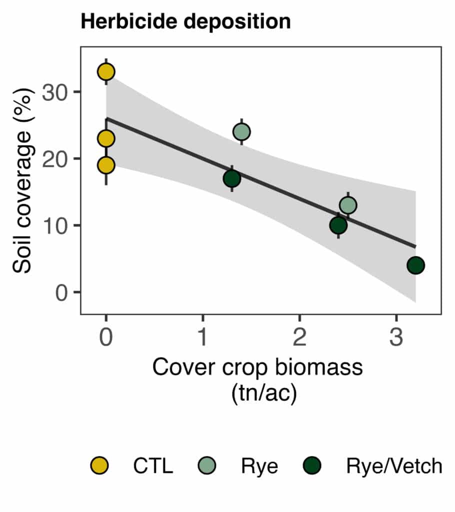 The third piece of the herbicide-cover crop question is more complicated and involves how both burndown and soil residual herbicides perform in combination with cover crops. Does the cover crop prevent the burndown herbicide from reaching emerged target weeds? Research from Penn State using water sensitive spray cards (TeeJet) showed that both cereal rye and a rye/vetch mixture interfered with herbicide deposition (Figure 6). The amount of interference depended on both cover crop species and cover biomass. Although less herbicide reached the soil (and the target weeds in theory) at the time the herbicide was applied, reduced herbicide performance was not observed in this experiment. Horseweed was a primary target and the study used a combination of glyphosate plus 2,4-D ester and standard Tee-Jet AIXR11002 tips applied at 20 GPA to control both cover crop and emerged weeds. Alternative herbicide selection and sprayer setup could impact burndown herbicide performance differently.