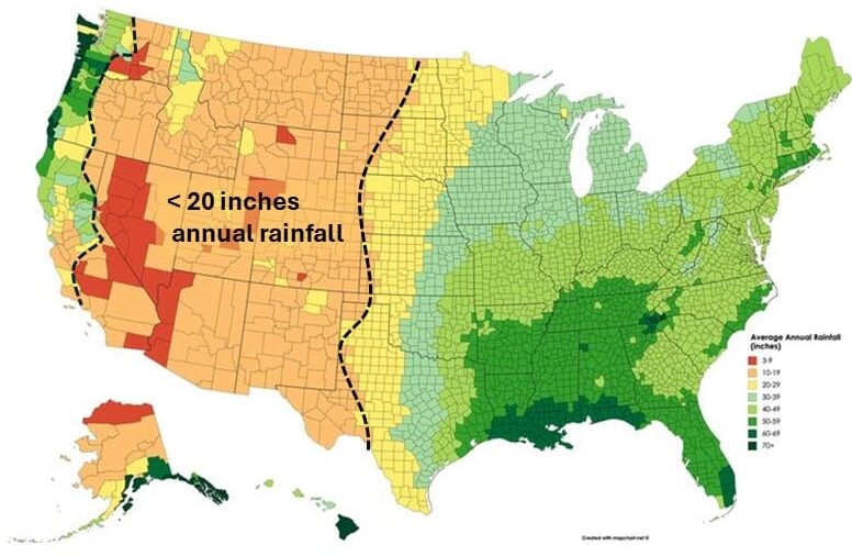 Cover crop adoption in lower rainfall environments has been limited. Imagine a line running south from the Canadian border, through the central Dakotas and across western Nebraska, Kansas, and Texas (see below image). To the west of that line, annual precipitation is less than 20 inches, and dryland cropping systems typically include a fallow period to help conserve soil moisture for the subsequent cash crop. These fallow periods present the greatest opportunity for integrating cover crops into these dryland cropping systems. However, several published studies show that introducing or substituting those fallow periods with soil-building cover crops often reduces the yield potential of subsequent cash crops. In this geography, growing high biomass weed suppressive cover crops is not practical or recommended.