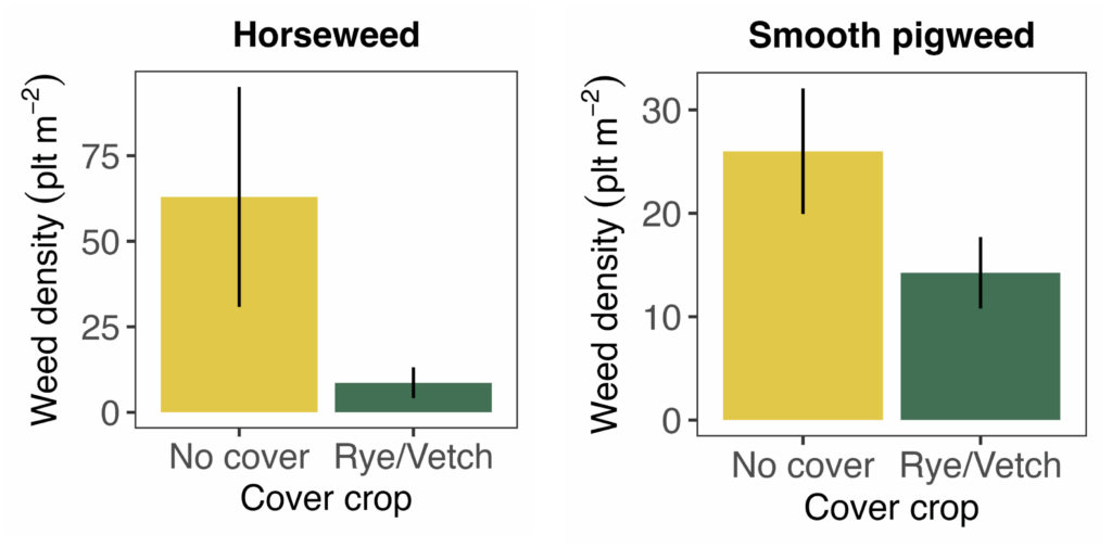 The target weeds should align with the life cycle of the cover crops. For example, winter annual weeds such as horseweed/marestail, chickweeds and shepherd’s-purse are good candidates for winter annual cover crops seeded in late summer and fall. As an example, cereal rye plus hairy vetch established in the fall reduced horseweed density when measured at spring burndown in a Penn State study (Figure 3).