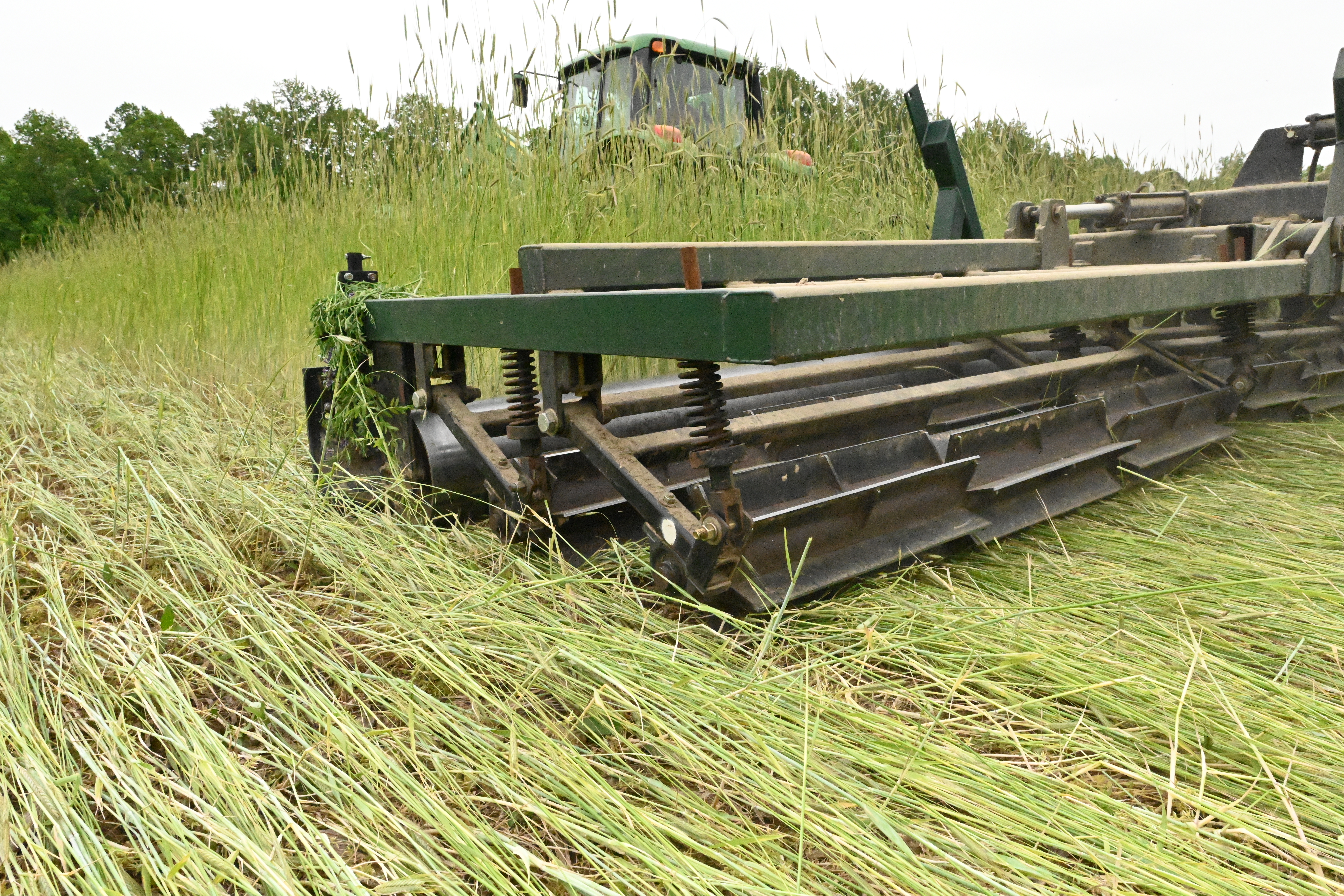 A roller-crimper is an implement used to terminate some cover crops. This implement consists of a round drum with angled fins, often weighed down with water, that knock down a cover crop and damage or break the vascular system to kill the plants. Newer versions of the roller-crimper consist of two mechanisms: a smooth drum with a spring-loaded crimping device right behind. This design, though it has more components, provides the crimper with more force with which to effectively kill the cover crop. Learn more about the advantages and limitations of roller-crimping here.