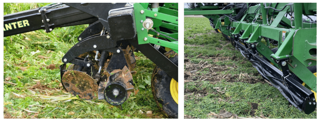 For roller crimpers, traditional machines are often operated independently from planting. However, at least two companies sell planter attachments designed to help manage higher biomass cover crops. Dawn Biologic sells the “ZRX” zone roller that has row cleaning disks and mini roller-crimpers attached to the frame of the planter, allowing the user to roll/crimp/manage residue and plant in one pass (see images below). In addition, Yetter Mfg. sells the Yetter 5000 “Cover Crop Devastator” as a planter mounted roller crimper also for single pass operations.