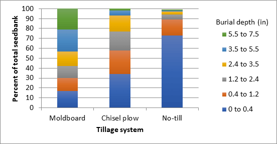 As seen in Figure 1, Wisconsin researchers observed a more even vertical distribution of weed seeds after multiple years of moldboard plowing than after multiple years of chisel plowing and no-tillage, where weed seeds were more concentrated at the top of the soil profile in both systems.