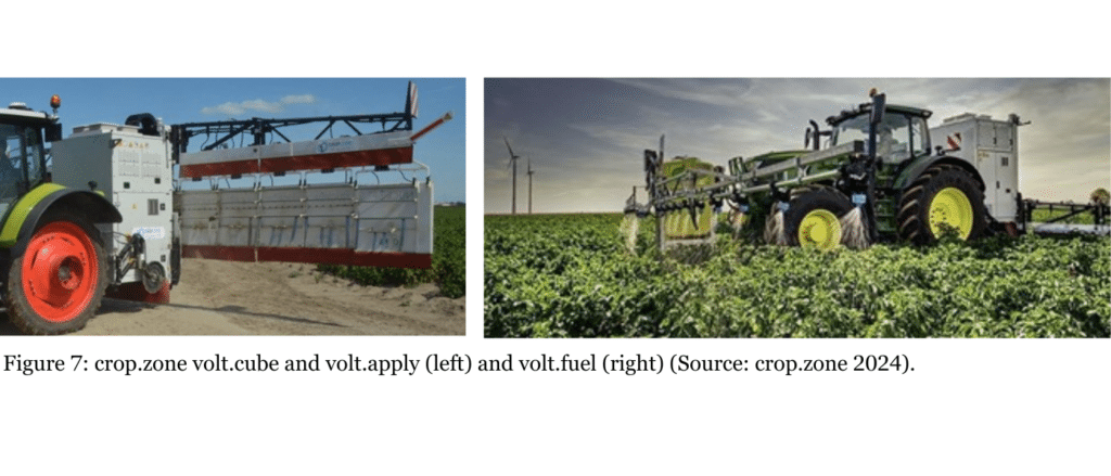 crop.zone volt system – The crop.zone system is a continuous-contact electrical weeder that combines three main components: the volt.cube, volt.apply and volt.fuel. The volt.cube is the generator portion that attaches to the back of a tractor and generates electricity using the PTO (Figure 7). The volt.apply is the “boom” portion of the system located behind the volt.cube, which delivers the current to the plants and can range between 30 and 40 feet in width. Lastly, the volt.fuel is a proprietary conductive liquid reported to improve the system’s effectiveness. The volt.fuel is applied via a spray boom attached to the front of the tractor. The volt system is for broadcast only and can be used for preplant burndown of weeds, crop desiccation, and cover crop termination. Although not currently available in the U.S., crop.zone systems are being sold in Europe and Canada, with plans for expansion into the U.S.