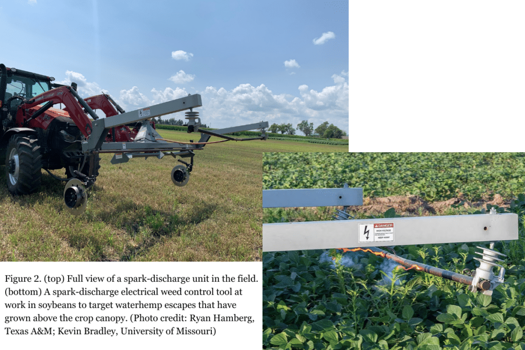Research results from the University of Missouri demonstrated that a spark-discharge electrical weeder called the Weed Zapper (Old School Manufacturing) provided the best control of waterhemp in soybeans (achieving 96% control 42 days after treatment). This level of control was most effective when there were consistent height differences between the crop and the weed, which occurred at the R6 soybean stage in this study. Conversely, waterhemp control was much lower (54% control at 42 days after treatment) when the plants were shorter than the crop.