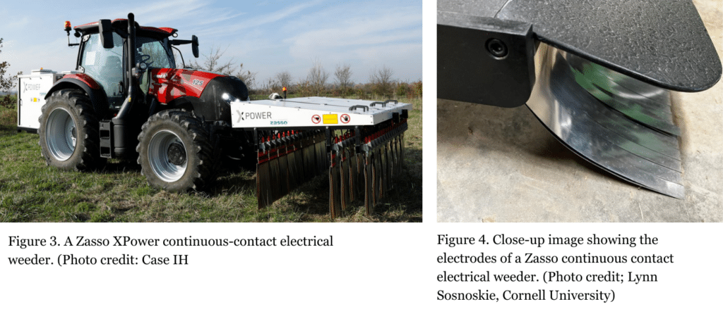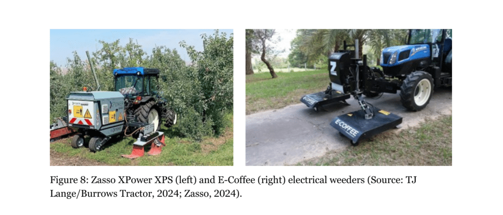 The Zasso XPower Series – The Zasso XPower series are continuous-contact electrical weeders for use in various specialty crops such as citrus, orchards, and coffee. The XPS system features either fixed or moveable electrodes that target weeds in the interrow area of crops (Figure 8). Horsepower requirements vary by model but range between 64 to 150. The spring-loaded design allows passive rotation around the stem or trunk of vines and trees. Zasso also has a line of electrical weeders for residential, commercial, and other non-crop areas.