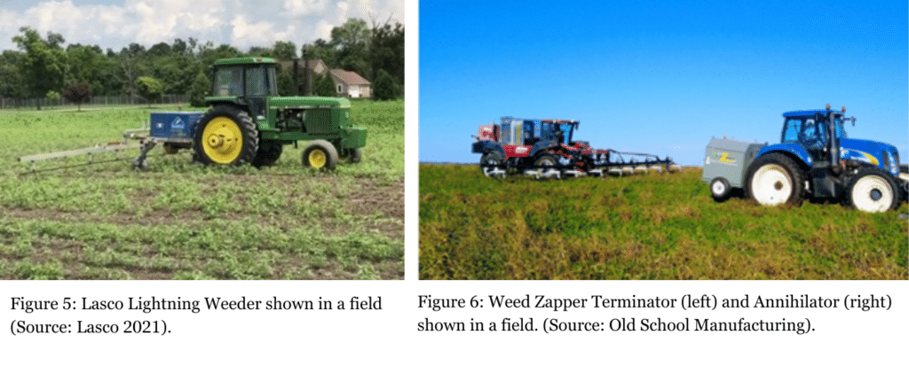 Lasco Lightning Weeder – The Lasco weeders use a spark-discharge method and are suitable for short-stature row crops such as soybeans, peanuts, cotton, etc. Application width can vary, but the maximum is 40ft and requires a tractor that has at least 140 PTO horsepower (HP). The applicator and generator hook to a 3-point attachment and are both located behind the tractor (Figure 5). The Lasco weeder has a copper bar electrode that spans the entire operating width of the unit, passing current through any plants that come into contact with it.