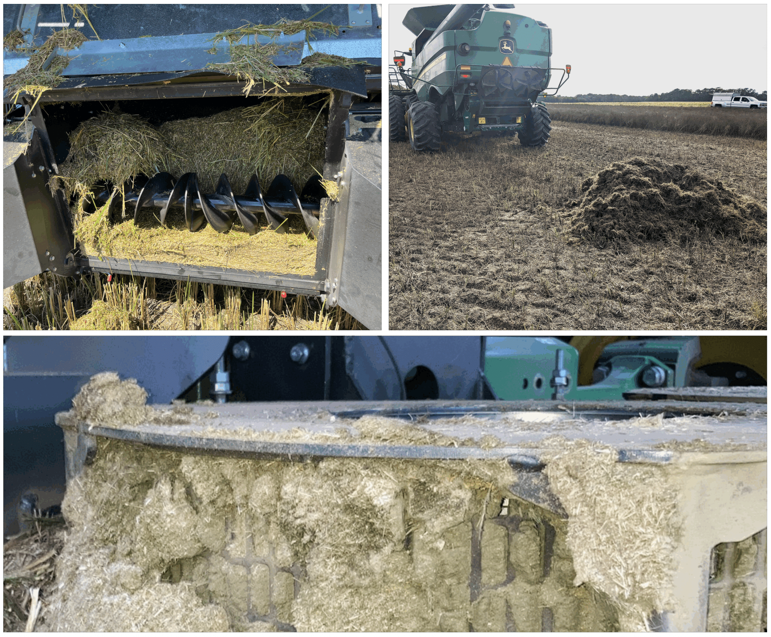 Green harvest materials are the enemy of seed impact mills due to their high moisture content. Harvest residues need to be sufficiently dry to avoid plugging or damaging the mills or increasing horsepower consumption. Grain moisture is not a good indicator of chaff moisture. Problematic moisture can come from other parts of the crop, such as green stems in soybeans, or from weeds present in the field, such as purple ammannia in rice, pigweeds in soybean, or kochia in wheat.