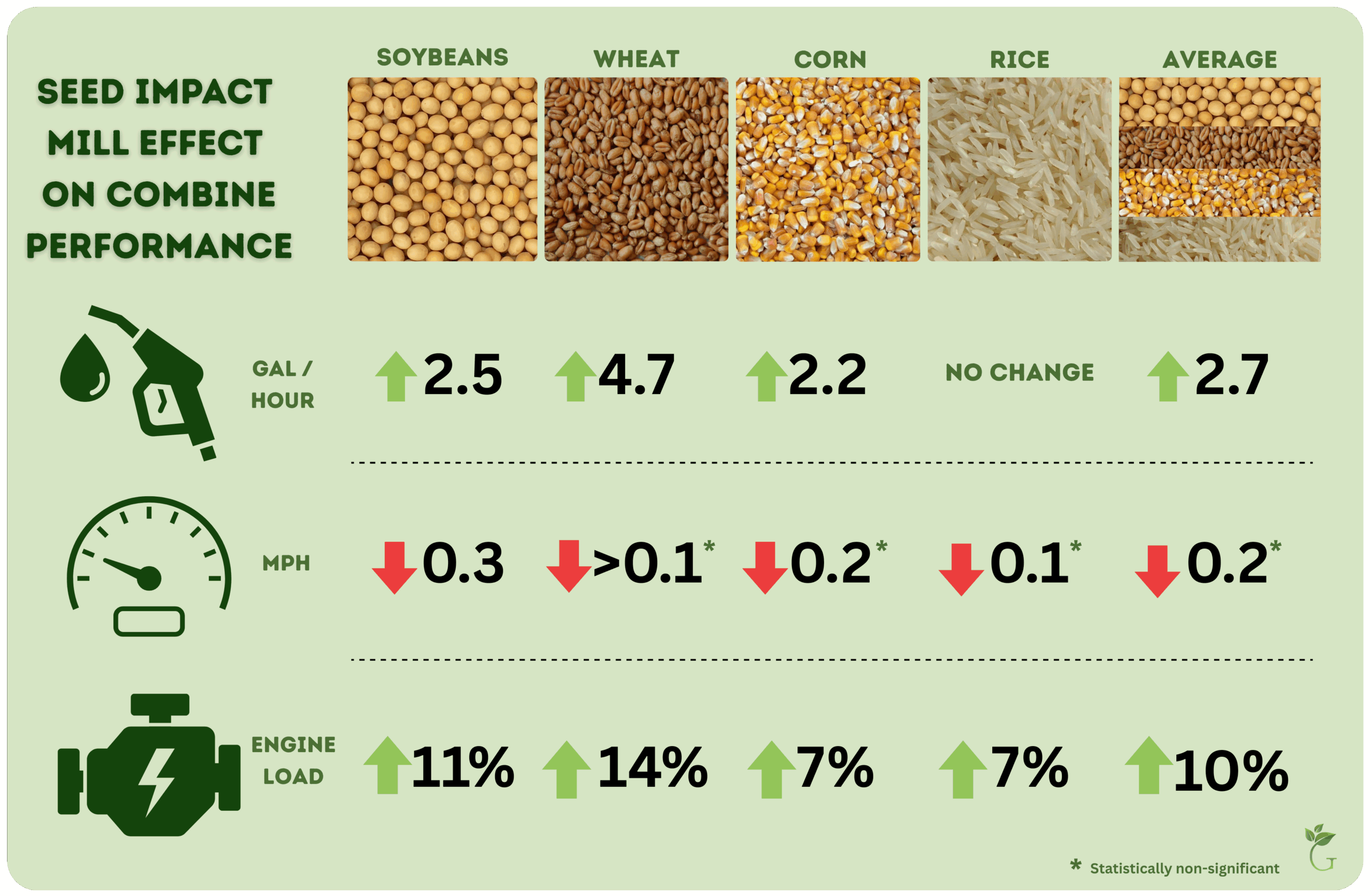 A seed impact mill will result in about 2.7 gallons per hour higher fuel consumption, 9.7% increased demand on engine capacity, and a 0.2 mph reduction in travel speed, according to GROW testing across corn, rice, soybean, and wheat under various harvest conditions, combine setups, and both Redekop SCU and iHSD seed impact mills (see Figure 3).