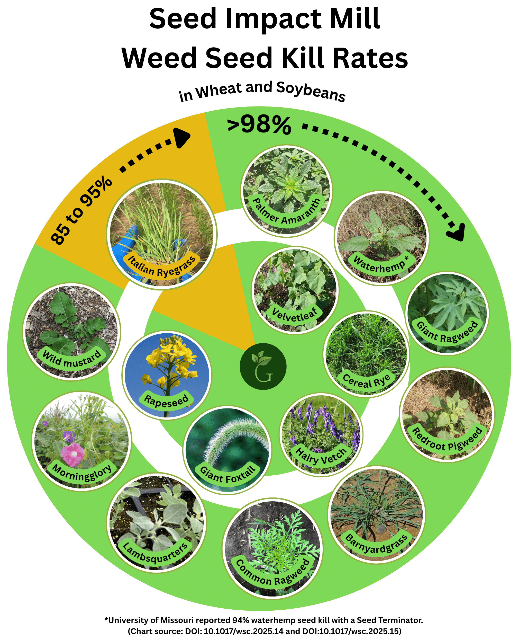 Seed impact mills have a very high kill rate, typically greater than 98% for most weed species evaluated. One exception is Italian ryegrass, which showed kill rates of 85–95% in university testing (Figure 2). Research shows that seeds not completely killed by seed impact mills will likely not survive the winter. Crop seed is also controlled by the mills, leading to reduced issues with volunteers.