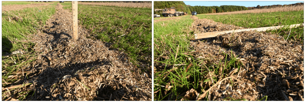 No issues with reduced crop emergence have been reported in winter fallow crop rotations after fall harvest with chaff lining. However, chaff lines can reduce crop emergence in some situations. Wheat chaff lines may reduce double crop soybean emergence if seeded with a drill. Planters with row cleaners should not encounter major issues from the chaff lines. Soybean chaff lines may reduce subsequently drilled cover crop or winter wheat stands, but nitrogen release from the chaff line may offset fewer fall tillers with greater spring growth.