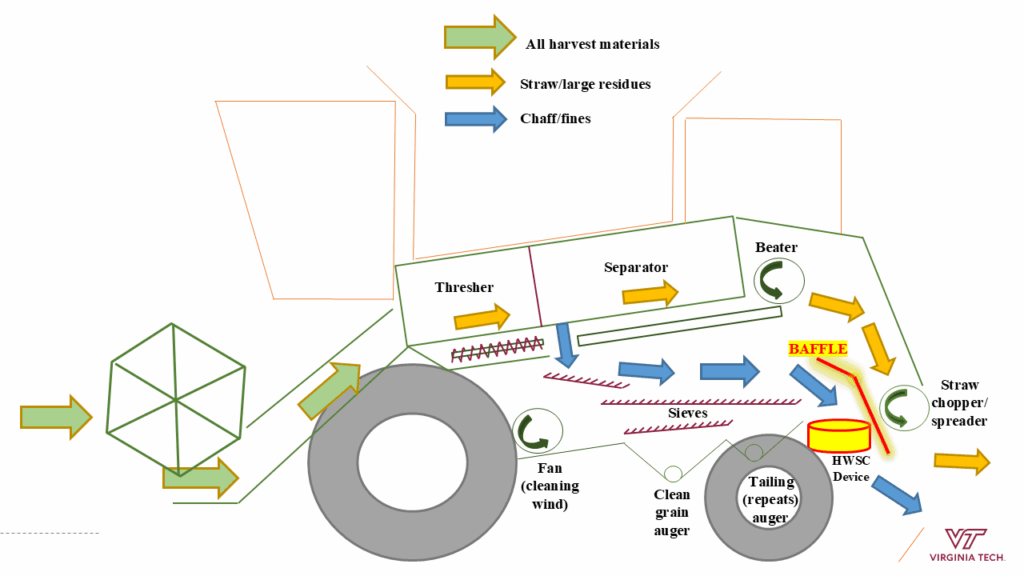 Any combine can be modified for chaff lining. Combine models where the chaff (harvest material that comes off the sieves or shoe) and straw (materials that come out of the rotor) come together prior to spreading will need a baffle to keep these materials separate (Figure 1). Weed seeds exit the combine in the chaff portion, so straw materials can be spread as normal. The baffle directs weed seed–containing chaff into a chute, which creates the chaff line as the combine moves across the field.