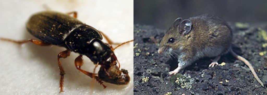 Ground-dwelling insects like some beetle or cricket species will feed on weed seeds. Rodents also will consume significant number of weed seeds. (Photo: credits beetle by Eric Gallandt, University of Maine; field mouse, unknown source)