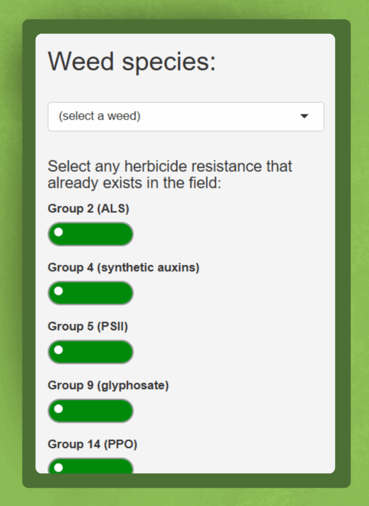 - Specify if you battle Group 2, 4, 5, 9, 14, and/or 27 resistance (for help with herbicide groups, see the Take Action Herbicide Classification chart and look-up tool).