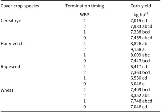 Terminating any of the cover crop species two weeks before planting resulted in 11% and 25% less grass and small-seeded broadleaf weed density compared to terminating four weeks before planting, respectively.